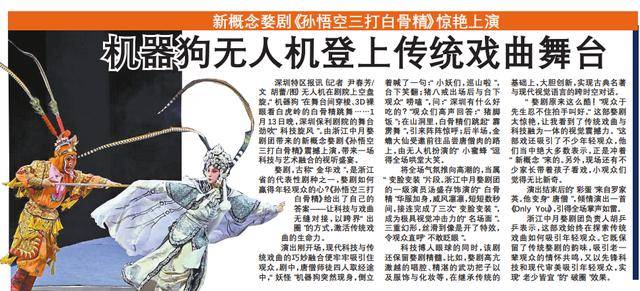 无人机正在剧院上空回旋,“机械狗”正在舞台间穿越、3D裸眼看白虎岭的白骨精跳舞……1月13日晚,